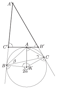 Ha \(\displaystyle ABC\) tompaszögű, akkor feltehetjük, hogy \(\displaystyle \alpha >90^{\circ}\) (3. ábra). Ekkor az \(\displaystyle ABC\) háromszög körülírt köre az \(\displaystyle A'B'C'\) háromszögnek a \(\displaystyle B'C'\) oldalához hozzáírt köre. Ebben az esetben a \(\displaystyle KAC'B\), \(\displaystyle KAB'C\) és \(\displaystyle KCA'B\) négyszögek húrnégyszögek, mert két-két szemközti szögük derékszög. A keresett szögek most a \(\displaystyle KCA'B\) húrnégyszög \(\displaystyle K\)-val szemközti szöge, valamint a \(\displaystyle KAB'C\) és \(\displaystyle KAC'B\) húrnégyszögek \(\displaystyle K\)-val szemközti csúcsnál lévő külső szögei. Bármely húrnégyszögben a szemközti csúcsnál lévő külső szög megegyezik az eredeti csúcsnál lévő belső szöggel, ezért ebben az esetben az \(\displaystyle A'B'C'\) háromszög szögei \(\displaystyle 180^{\circ}-(360^{\circ} - 2\alpha)=2\alpha - 180^{\circ}\), \(\displaystyle 2\gamma\) és \(\displaystyle 2\beta\).