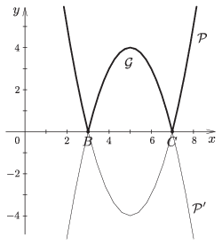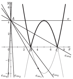 Az \(\displaystyle Y=X^2-10X+21\) függvény képe egy olyan felfelé nyíló \(\displaystyle {\mathcal P}\) parabola, mely a \(\displaystyle B=(3;0)\) és a \(\displaystyle C=(7;0)\) pontokban metszi az \(\displaystyle x\) tengelyt (mert az \(\displaystyle x^2-10x+21=0\) egyenlet gyökei \(\displaystyle 3\) és \(\displaystyle 7\)). Ezért az \(\displaystyle Y= \big|X^2-10X+21\big|\) függvény \(\displaystyle {\mathcal G}\) képét úgy kapjuk, hogy \(\displaystyle x\le 3\), valamint \(\displaystyle 7\le x\) esetén tekintjük \(\displaystyle {\mathcal P}\) megfelelő íveit, ha pedig \(\displaystyle 3< x <7\), akkor \(\displaystyle {\mathcal P}\)-nek az \(\displaystyle x\)-tengelyre vonatkozó \(\displaystyle {\mathcal P}'\) tükörképét, ami éppen az \(\displaystyle Y=- \big(X^2-10X+21\big)\) egyenletű parabola megfelelő íve (1. ábra). Azt kell tehát meghatároznunk, hogy az \(\displaystyle e_m\) egyenesnek hány közös pontja van a két parabola darabjaiból összerakott görbével.
