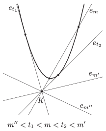Tudjuk, hogy egy külső \(\displaystyle K\) pontból egy parabolához két érintő húzható (lásd pl. Kiss Gy.: Amit jó tudni a kúpszeletekről I. és II., KöMaL 54 (2004), 450-459. és 514-518. o.). Ha a koordinátarendszerben egy parabola tengelye függőleges, akkor a \(\displaystyle K\)-n átmenő egyenesek közül a függőlegesnek egy közös pontja van a parabolával, ha pedig a \(\displaystyle K\)-ból a parabolához húzott érintők meredeksége \(\displaystyle t_1<t_2\), akkor a \(\displaystyle K\)-n átmenő \(\displaystyle m\) meredekségű egyeneseknek \(\displaystyle t_1< m < t_2\) esetén nincs, \(\displaystyle m< t_1 \) és \(\displaystyle t_2 < m \) esetén pedig pontosan két közös pontjuk van a parabolával (2. ábra).