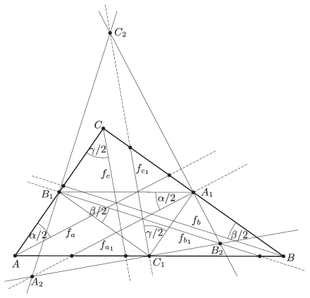 Egy háromszög két csúcsában húzott külső és a harmadik csúcsban húzott belső szögfelezője egy pontban, a háromszög hozzáírt körének középpontjában metszi egymást, ezért az \(\displaystyle A_{1}B_{1}C_{1}\triangle\) külső szögfelezőinek \(\displaystyle A_{2}\), \(\displaystyle B_{2}\), \(\displaystyle C_{2}\) metszéspontjain rendre áthaladnak az \(\displaystyle f_{a_{1}}\), \(\displaystyle f_{b_{1}}\), \(\displaystyle f_{c_{1}}\) szögfelezők. Ezek rendre egybeesnek az \(\displaystyle A_{1}A_{2}\), \(\displaystyle B_{1}B_{2}\), \(\displaystyle C_{1}C_{2}\) egyenesekkel.