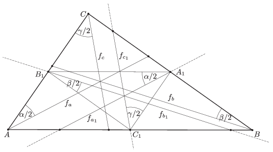 Megoldás. Legyenek az \(\displaystyle A\), \(\displaystyle B\), \(\displaystyle C\) pontokból induló belső szögfelezők \(\displaystyle f_{a}\), \(\displaystyle f_{b}\), \(\displaystyle f_{c}\). Az \(\displaystyle A_{1}B_{1}C_{1}\) középvonal háromszög belső szögfelezői legyenek \(\displaystyle f_{a_{1}}\), \(\displaystyle f_{b_{1}}\), \(\displaystyle f_{c_{1}}\). Az \(\displaystyle ABC\) és \(\displaystyle A_{1}B_{1}C_{1}\) háromszögek oldalai páronként párhuzamosak és megfelelő szögeik egyenlők, ezért \(\displaystyle f_{a_{1}}\parallel f_{a}\), \(\displaystyle f_{b_{1}}\parallel f_{b}\), \(\displaystyle f_{c_{1}}\parallel f_{c}\).