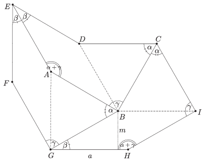 amiből \(\displaystyle \alpha +\beta +\gamma =180^{\circ}\). Ez azt mutatja, hogy a \(\displaystyle GB\) szakasz párhuzamos a \(\displaystyle HI\) szakasszal, így a \(\displaystyle BGHI\) négyszög rombusz, vagyis a \(\displaystyle BI\) távolság is \(\displaystyle a=7\) cm. Ekkor a \(\displaystyle CBI\) háromszög szabályos, amiből \(\displaystyle \alpha =60^{\circ}\).