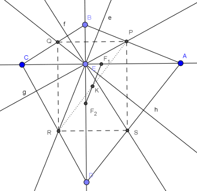 Az \(\displaystyle AB\) szakasz és a \(\displaystyle g\) egyenes metszéspontja legyen a \(\displaystyle P\) pont, a \(\displaystyle BC\) szakasz és a \(\displaystyle h\) egyenes metszéspontja a \(\displaystyle Q\) pont, a \(\displaystyle CD\) szakasz és az \(\displaystyle e\) egyenes metszéspontja az \(\displaystyle R\) pont, valamint a \(\displaystyle DA\) szakasz és az \(\displaystyle f\) egyenes metszéspontja az \(\displaystyle S\) pont.