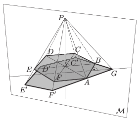 Vegyünk fel a térben egy \(\displaystyle \mathcal{S}\) síkot és abban egy \(\displaystyle ABCDEF\) szabályos hatszöget, továbbá legyen a hatszög középpontján átmenő, \(\displaystyle \mathcal{S}\)-re merőleges egyenesen \(\displaystyle P\) egy \(\displaystyle \mathcal{S}\)-re nem illeszkedő pont. Legyen \(\displaystyle \mathcal{S}'\) egy \(\displaystyle AB\)-re illeszkedő, \(\displaystyle \mathcal{S}\)-től különböző olyan sík, mely által meghatározott két féltér közül az egyik tartalmazza az \(\displaystyle ABCDEF\) hatszöget, és metszi a \(\displaystyle P\)-ből induló \(\displaystyle PC\), \(\displaystyle PD\), \(\displaystyle PE\) és \(\displaystyle PF\) félegyenesek mindegyikét, rendre a \(\displaystyle C'\), \(\displaystyle D'\), \(\displaystyle E'\) és \(\displaystyle F'\) pontokban. Ilyen sík nyilván végtelen sok létezik, úgy kaphatjuk meg őket, hogy \(\displaystyle \mathcal{S}\)-et az \(\displaystyle AB\) egyenes körül megfelelő irányban forgatjuk (lásd az ábrát).