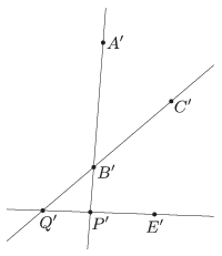 Vegyünk fel az \(\displaystyle A'B'\) egyenesen egy \(\displaystyle A'\)-től és \(\displaystyle B'\)-től különböző \(\displaystyle P'\) pontot, majd tekintsük az \(\displaystyle E'P'\) egyenest. Ez az egyenes az \(\displaystyle A'C'\) és \(\displaystyle B'C'\) egyenesek közül legalább az egyiket metszi, mivel legfeljebb csak az egyikkel lehet párhuzamos. Legyen az egyik ilyen metszéspont \(\displaystyle Q'\). Ekkor \(\displaystyle Q\), \(\displaystyle P\) és \(\displaystyle E\) pontok képei egy egyenesre illeszkednek, vagyis a \(\displaystyle Q\), \(\displaystyle P\) és \(\displaystyle E\) pontok is egy egyenesre esnek. Mivel \(\displaystyle Q'\) rajta van az \(\displaystyle A'C'\) vagy a \(\displaystyle B'C'\) egyenesen, \(\displaystyle P'\) pedig az \(\displaystyle A'B'\) egyenesen, így őseik, \(\displaystyle Q\) és \(\displaystyle P\) az \(\displaystyle AB\) egyenesen vannak. Ezért \(\displaystyle E\)-nek is az \(\displaystyle AB\) egyenesen kell lennie. Ez viszont ellentmondás, hiszen \(\displaystyle E\)-t úgy választottuk meg, hogy ne illeszkedjen az \(\displaystyle AB\) egyenesre. Vagyis a kiinduló feltétel hamis, azaz ha három pont egy egyenesre esik, akkor a képeik is egy egyenesre esnek.