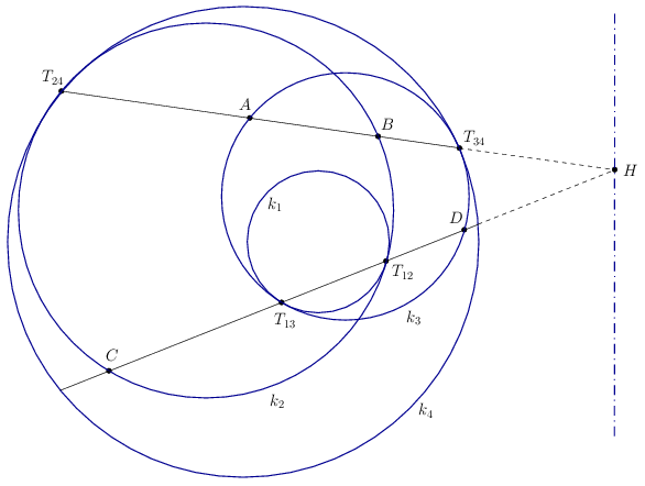 Megoldásvázlat. Jelöljük \(\displaystyle H\)-val a \(\displaystyle k_2\) és \(\displaystyle k_3\) külső hasonlósági pontját. Jelöljük \(\displaystyle T_{ij}\)-vel a \(\displaystyle k_i\) és \(\displaystyle k_j\) körök érintési pontját (\(\displaystyle (i,j)=(1,2),(1,3),(2,4),(3,4)\)). A \(\displaystyle T_{12}T_{13}\) és \(\displaystyle T_{24}T_{34}\) egyeneseknek a körökkel vett metszéspontjait jelöljük az ábra szerint.