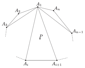 Tegyük fel, hogy a pontok nem egy konvex \(\displaystyle 2015\)-szög csúcsai. Mivel a pontok nem esnek egy egyenesre, ezért ekkor konvex burkuk, \(\displaystyle \mathcal{K}\), egy konvex \(\displaystyle n\)-szög valamely \(\displaystyle n<2015\) egészre, továbbá a pontok közül legalább egy \(\displaystyle \mathcal{K}\) belsejébe esik. Válasszuk ki \(\displaystyle \mathcal{K}\) egyik csúcsát (az ábrán \(\displaystyle A_1\)), és húzzuk be az ebből kiinduló \(\displaystyle n-3\) darab átlót. Ezek \(\displaystyle \mathcal{K}\)-t \(\displaystyle n-2\) darab háromszögre osztják, s e háromszögek teljesen lefedik \(\displaystyle \mathcal{K}\)-t. Ezért ha \(\displaystyle P\) olyan pont a \(\displaystyle 2015\) közül, mely \(\displaystyle \mathcal{K}\) belsejébe esik, akkor az átlók által meghatározott \(\displaystyle n-2\) háromszög között van egy olyan (az ábrán \(\displaystyle A_1A_iA_{i+1}\)), amelyiknek a belsejébe esik. Ekkor viszont \(\displaystyle P\) és az azt tartalmazó háromszög három csúcsa nem alkot konvex négyszöget. Ez az ellentmondás bizonyítja állításunkat.