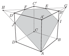 Megoldás. Legyen a kocka éle egységnyi. Az \(\displaystyle AEF\) sík és az \(\displaystyle A'B'\) egyenes metszéspontja a \(\displaystyle G\), az \(\displaystyle A'D'\) egyenes és a sík metszéspontja a \(\displaystyle H\) pont. A metszéspontok léteznek, mert a sík egyik egyenessel sem párhuzamos. Legyen továbbá az \(\displaystyle AEF\) sík metszéspontja a \(\displaystyle BB'\) és a \(\displaystyle DD'\) egyenesekkel rendre az \(\displaystyle I\) és a \(\displaystyle J\) pont. Ekkor a kockából az \(\displaystyle AEF\) síkkal lemetszett, az \(\displaystyle A'\) pontot tartalmazó rész térfogatát megkapjuk, ha az \(\displaystyle AA'GH\) tetraéder térfogatából levonjuk a \(\displaystyle B'GIE\) és a \(\displaystyle D'HJF\) tetraéder térfogatát.