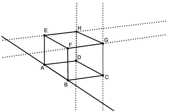 Az \(\displaystyle EH\) és \(\displaystyle FG\) párhuzamos egyenesek egy-egy pontján átmenő egyenes benne van az \(\displaystyle EFGH\) síkban. Ugyanígy a \(\displaystyle CG\) és \(\displaystyle DH\) párhuzamos egyenesek egy-egy pontján átmenő egyenes pedig benne van a \(\displaystyle CGHD\) síkban. Ennek a két síknak csak egy közös egyenese van, a \(\displaystyle HG\) egyenes. Ez párhuzamos az \(\displaystyle AB\) élegyenessel.