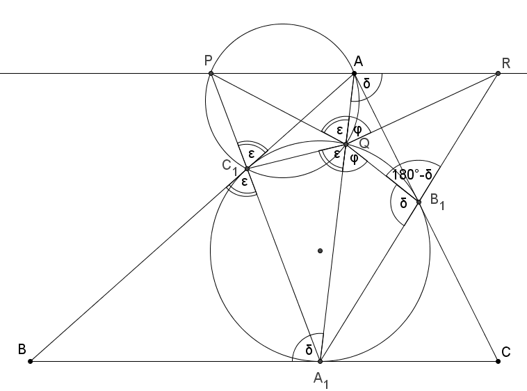 \(\displaystyle A_1AR\angle=QA_1B\angle=\delta\), mert váltószögek, hiszen \(\displaystyle PR\parallel BC\).