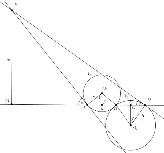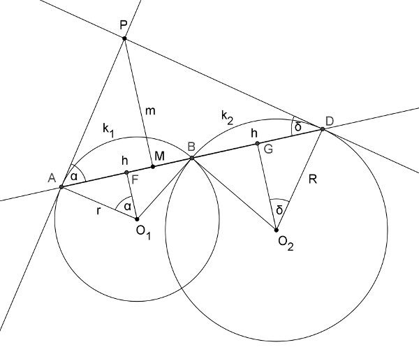 Legyen az \(\displaystyle ADP\) háromszög \(\displaystyle P\)-ből induló magassága \(\displaystyle m\), talppontja \(\displaystyle M\), a húrok hossza \(\displaystyle AB=BD=h\), felezőpontjaik rendre \(\displaystyle F\) és \(\displaystyle G\). A \(\displaystyle PAB\angle=\alpha\) szög a \(\displaystyle k_1\) kör \(\displaystyle AB\) húrjához tartozó érintő szárú kerületi szög. Ugyanehhez a húrhoz tartozó középponti szög \(\displaystyle AO_1B\angle=2\alpha\), az \(\displaystyle AO_1F\angle=\alpha\), mert ennek a fele. Így \(\displaystyle PAB\angle=\alpha=AO_1F\angle\), ami azt jelenti, hogy a \(\displaystyle PMA\) és az \(\displaystyle AFO_1\) derékszögű háromszögek hasonlóak. Ugyanígy belátható, hogy a \(\displaystyle PMD\) és a \(\displaystyle DGO_2\) derékszögű háromszögek is hasonlóak. A megfelelő oldalak arányának egyenlőségét felírva: \(\displaystyle \frac{PA}{r}=\frac{m}{(h/2)}=\frac{PD}{R}\), vagyis \(\displaystyle \frac{PA}{r}=\frac{PD}{R}\). Ebből a keresett arány: \(\displaystyle \frac{PA}{PD}=\frac{r}{R}\).