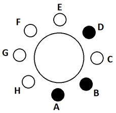 b) A D helyen egy nő ül, a másik három helyen pedig férfi (2. ábra). Ekkor, ha a negyedik férfi az E vagy F helyen ül, akkor a C, D, E, F, ha a G vagy H helyen ül, akkor az F, G, H, A helyeken ülőket kiválasztva teljesül az állítás.