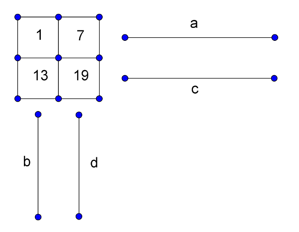 Megoldás. Jelöljük a (felülnézet szerinti) bal felső kocka lapjainak helyzetét 1, 2, 3, 4, 5, 6-tal, az 1-es a felső. Hasonlóan számozzuk a többi kocka lapjainak helyzetét is, a felül levők a 7-es, 13-as és a 19-es. Ha egy mozgatás során például a 1-es helyen levő lap a 2-esbe, az 2-es a 3-asbe, a 3-es pedig az 1-esbe kerül, továbbá a 4-es az 5-ösbe, az 5-ös a 6-osba, az pedig a 4-esba, akkor a mozgatást \(\displaystyle (1,2,3)(4,5,6)\)-tal jelöljük. Két mozgatás egymásutánját szorzatként jelöljük, egy \(\displaystyle m\) mozgatás inverzét pedig jelölje \(\displaystyle m^{-1}\). A négy tengely körüli 90°-os elforgatások az ábra szerint \(\displaystyle a\), \(\displaystyle b\), \(\displaystyle c\) és \(\displaystyle d\).