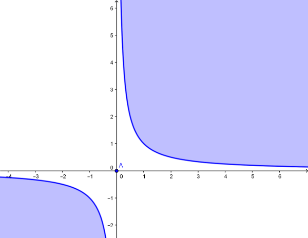 Az \(\displaystyle XY=1\)-hez tartozó görbe egy egyenlő szárú hiperbola. A keresett ponthalmaz: a pozitív hiperbolaív feletti pontok, a negatív hiperbolaív alatti pontok és az origó.