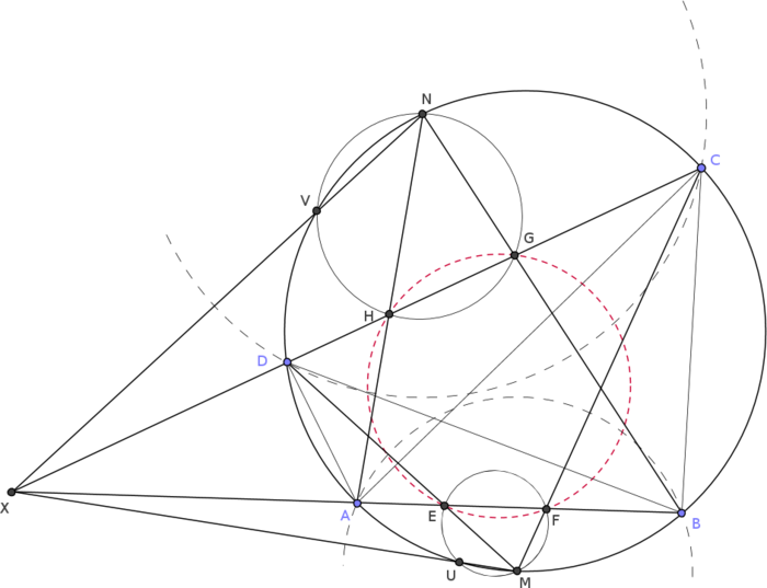 Teintsük az \(\displaystyle M\) középpontú, \(\displaystyle A,B\)-n átmenő körre vonatkozó inverziót. Ez az \(\displaystyle A,B,C,D,X\) pontokat rendre az \(\displaystyle A,B,F,E,U\) pontokba viszi. A \(\displaystyle CDX\) egyenes képe \(\displaystyle M\)-en átmenő kör, ezért \(\displaystyle E,F,U,M\) egy körön van. Ugyanígy láthatjuk, hogy \(\displaystyle G,H,V,N\) egy körön van.