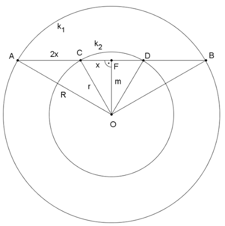 A metszéspontok legyenek \(\displaystyle C\) és \(\displaystyle D\), a húr felezőpontja \(\displaystyle F\), és \(\displaystyle OF=m\). Legyen \(\displaystyle CF=x\), ekkor \(\displaystyle AC=CD=2x\).