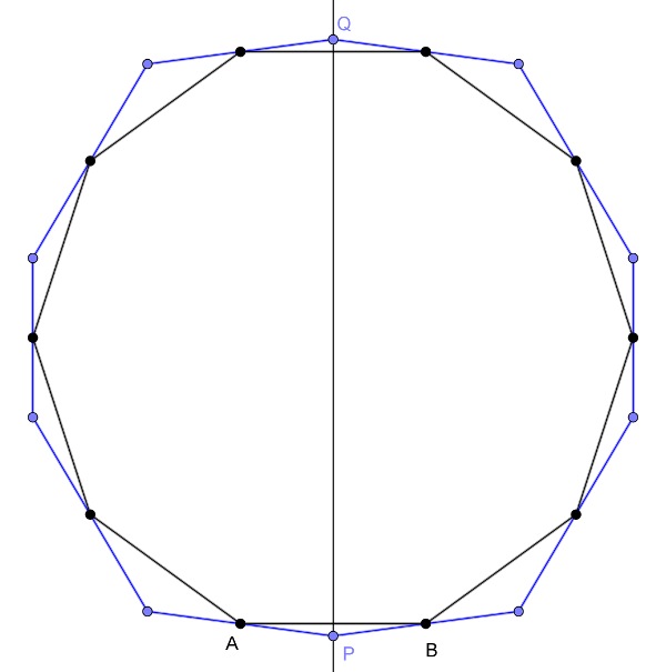 Páros sok pont esetén nem igaz az állítás. Tekintsük a felezőpontokból álló szabályos sokszög \(\displaystyle AB\) oldalának felezőmerőlegesét, és ezen egy megfelelő \(\displaystyle P\) pontot. Ezt tükrözzük sorban a felezőpontokra az \(\displaystyle A\), illetve a \(\displaystyle B\) pont irányában elindulva. A szimmetria miatt mindkét irányban a \(\displaystyle Q\) ponthoz jutunk. A kapott kék sokszög az eredeti sokszög, ami nem feltétlenül szabályos.
