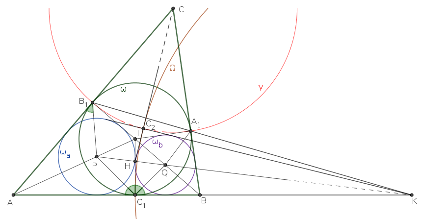 Az \(\displaystyle \omega_a\), \(\displaystyle \omega_b\) és \(\displaystyle \Omega\) köröknek a \(\displaystyle C_1I\) egyenes közös érintője. A másik közös érintőt úgy kaphatjuk, hogy az \(\displaystyle C_1I\) egyenest tükrözzük a \(\displaystyle PQK\) centrálisra. Legyen \(\displaystyle PQ\) és \(\displaystyle C_1I\) metszéspontja \(\displaystyle H\), és legyen \(\displaystyle C_2\) a \(\displaystyle C_1\) tükörképe a \(\displaystyle PQK\) egyenesre. Ekkor tehát \(\displaystyle HC_2\) a másik közös érintője az \(\displaystyle \omega_a\), \(\displaystyle \omega_b\) és \(\displaystyle \Omega\) köröknek, és azt kell igazolnunk, hogy a \(\displaystyle HC_2\) egyenes a \(\displaystyle C\) ponton is átmegy. Ehhez előbb azt mutatjuk meg, hogy \(\displaystyle C_2\) rajta van a \(\displaystyle \gamma\) körön.
