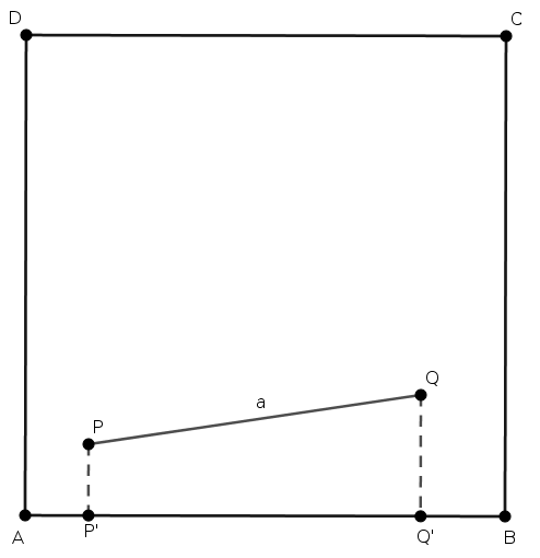 Tegyük fel tehát, hogy a háromszög \(\displaystyle PQ\) oldala a négyzet \(\displaystyle AB\) oldalával \(\displaystyle \alpha\leq 15^\circ\)-os szöget zár be, és jelölje \(\displaystyle P'\), ill. \(\displaystyle Q'\) a \(\displaystyle P\) és \(\displaystyle Q\) pontok merőleges vetületét \(\displaystyle AB\)-n (lásd ábra). Ekkor