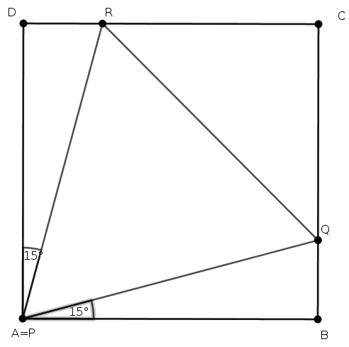 Ez az utolsó ábrán látható módon nyilvánvalóan el is érhető. Legyen ugyanis \(\displaystyle A=P\) és válasszuk a \(\displaystyle Q\) és \(\displaystyle R\) pontokat a \(\displaystyle BC\), ill. \(\displaystyle CD\) oldalakon úgy, hogy \(\displaystyle BAQ\angle=RAD\angle= 15^\circ\) teljesüljön. Ekkor nyilvánvalóan \(\displaystyle QPR\angle=60^\circ\), és az ábra az \(\displaystyle AC\) egyenesre szimmetrikus, így \(\displaystyle PQR\) szabályos háromszög, és oldalának hossza \(\displaystyle a=1/\cos 15^\circ\). Az eddigiekből következik, hogy a maximális kerületű háromszög területe \(\displaystyle T=\frac {a^2\sqrt 3}{4}=\frac {\sqrt 3}{2+\sqrt 3}=2\sqrt 3-3\).