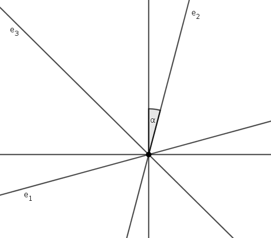 Először belátjuk, hogy \(\displaystyle PQR\) valamely oldala az \(\displaystyle ABCD\) négyzet valamely oldalával legfeljebb \(\displaystyle 15^\circ\)-os szöget zár be. Ehhez tekintsünk két egymásra merőleges egyenest, amelyek a négyzet egy-egy szemközti oldalpárjával párhuzamosak. Ezek négy \(\displaystyle 90^\circ\)-os szögtartományt határoznak meg. Ezután a metszésponton keresztül húzzunk \(\displaystyle e_1, e_2\) és \(\displaystyle e_3\) párhuzamos egyeneseket \(\displaystyle \Delta\) oldalaival. A skatulya-elv miatt valamely \(\displaystyle 90^\circ\)-os szögtartományba \(\displaystyle e_1, e_2\) és \(\displaystyle e_3\) közül legalább kettő belemetsz, mondjuk \(\displaystyle e_1\) és \(\displaystyle e_2\). Mivel \(\displaystyle e_1\) és \(\displaystyle e_2\) bezárt szöge \(\displaystyle 60^\circ\), így \(\displaystyle e_1\) és \(\displaystyle e_2\) közül valamelyik a derékszög egyik szárával \(\displaystyle \alpha\leq (90^\circ-60^\circ)/2=15^\circ\) szöget zár be, ahogyan állítottuk.