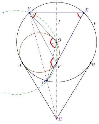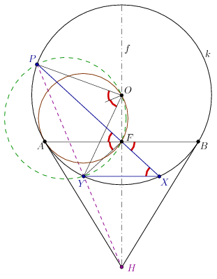 Az \(\displaystyle AB\) és \(\displaystyle XY\) szakaszok párhuzamosak, mert mindkettő merőleges \(\displaystyle f\)-re. \(\displaystyle PXY\sphericalangle = PFA\sphericalangle = XFB\sphericalangle =AFY\sphericalangle\) miatt \(\displaystyle PFY\sphericalangle=2\cdot PXY\sphericalangle\). A kerületi és középponti szögek tétele miatt pedig \(\displaystyle POY\sphericalangle=2\cdot PXY\sphericalangle\). Tehát \(\displaystyle PFY\sphericalangle=POY\sphericalangle\), a kerületi szögek tételének megfordítása szerint a \(\displaystyle P,Y,Z,O\) pontok egy körön vannak.