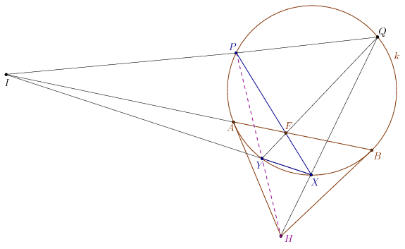 2. Jól ismert a következő projektív geometriai tény: Ha a \(\displaystyle P,Q,X,H\) pontok a \(\displaystyle k\) körön fekszenek, akkor az \(\displaystyle I=PQ\cap XY\), \(\displaystyle F=PX\cap QY\) és \(\displaystyle H=PY\cap QX\) pontok mindegyike a másik két pont által meghatározott egyenes \(\displaystyle k\)-re vonatkozó pólusa. Speciálisan, a \(\displaystyle H\) pont az \(\displaystyle FI\) egyenes \(\displaystyle k\)-re vonatkozó pólusa (és az \(\displaystyle FI\) egyenes a \(\displaystyle H\) pont polárisa). Ha \(\displaystyle H\) a körön kívül helyezkedik el, és az \(\displaystyle FI\) egyenes a kört az \(\displaystyle A\) és \(\displaystyle B\) pontokban metszi, akkor \(\displaystyle HA\) és \(\displaystyle HB\) a \(\displaystyle H\)-ból \(\displaystyle k\)-hoz húzott érintők.