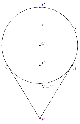 Legyen \(\displaystyle k\) középpontja \(\displaystyle O\), az \(\displaystyle AB\) húr felező merőlegese \(\displaystyle f\), ami átmegy az \(\displaystyle O\) és \(\displaystyle H\) pontokon. Az \(\displaystyle A\) és \(\displaystyle B\) pontok szerepe felcserélhető, ezért feltehetjük, hogy \(\displaystyle P\) az \(\displaystyle f\)-nek az \(\displaystyle A\) pontot tartalmazó oldalán van.