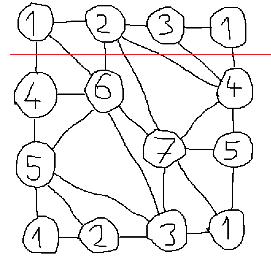 I. Ha elhagyjuk a bögre fülét és a rajta átvezetett görbéket, a fületlen görbe felülete a gömbbe folytonosan deformálható lesz, ezért a \(\displaystyle 7\) pont a megmaradó görbékkel egy síkba rajzolható gráfot alkot. Azt állítjuk, hogy ennek a \(\displaystyle 7\)-pontú síkgráfnak legfeljebb \(\displaystyle 15\) éle lehet. Ha esetleg a gráf nem összefüggő, néhány újabb élgörbe megrajzolásával összefüggővé tehetjük. Ezért állításunkat elég összefüggő gráfokra igazolni.