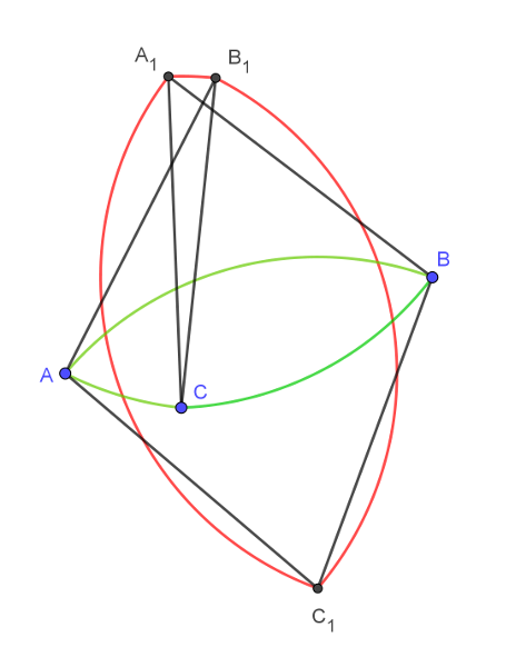 Megoldás. Az \(\displaystyle A\), \(\displaystyle B\) és \(\displaystyle C\) középpontú, egységnyi sugarú körök metszetét az \(\displaystyle \widehat{A_1B_1}\), \(\displaystyle \widehat{A_1C_1}\) és \(\displaystyle \widehat{B_1C_1}\) körívek határolják, ahol \(\displaystyle A_1\) a \(\displaystyle B\) és \(\displaystyle C\) középpontú egységkörök, \(\displaystyle B_1\) az \(\displaystyle A\) és \(\displaystyle C\) középpontú egységkörök, \(\displaystyle C_1\) pedig az \(\displaystyle A\) és \(\displaystyle B\) középpontú egységkörök egy-egy közös pontja. Az \(\displaystyle \widehat{AB}\), \(\displaystyle \widehat{AC}\) és \(\displaystyle \widehat{BC}\) körívek hosszának összege (a szögek ívmértékében) \(\displaystyle BC_1A\sphericalangle + AB_1C\sphericalangle + CA_1B\sphericalangle =k\). Hasonlóan az \(\displaystyle \widehat{A_1B_1}\), \(\displaystyle \widehat{A_1C_1}\) és \(\displaystyle \widehat{B_1C_1}\) körívek hosszának összege \(\displaystyle B_1CA_1\sphericalangle + A_1BC_1\sphericalangle + C_1AB_1\sphericalangle :=L\).