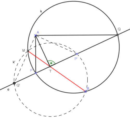 Ez a szorzat a \(\displaystyle P\) és \(\displaystyle Q\) pontok összes lehetséges helyzetére ugyanez az \(\displaystyle AT^2\), vagyis állandó. Vegyünk most egy olyan \(\displaystyle k\) kört, amely átmegy a \(\displaystyle P, B\) és \(\displaystyle Q\) pontokon és hosszabbítsuk meg a \(\displaystyle TB\) szakaszt úgy, hogy messe még egy pontban, az \(\displaystyle M\) pontban a \(\displaystyle k\) kört. A \(\displaystyle k\) kör \(\displaystyle T\) pontra vonatkozó hatványa alapján