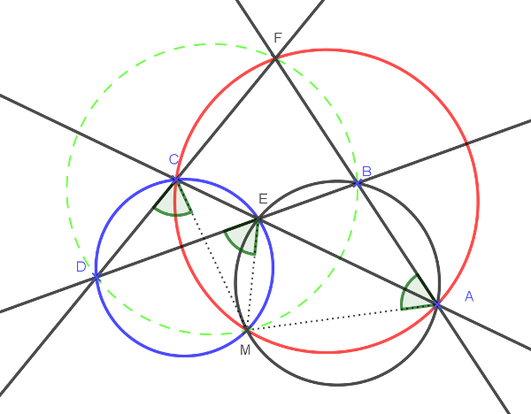 Megoldásvázlat. Először azt látjuk be, hogy a négy háromszög körülírt körének van közös pontja. Legyen a 4 megadott egyenes \(\displaystyle AB\), \(\displaystyle AC\), \(\displaystyle BD\) és \(\displaystyle CD\); az általuk meghatározott háromszögek pedig \(\displaystyle ABE\), \(\displaystyle ECD\), \(\displaystyle AFC\) és \(\displaystyle BFD\). Legyen továbbá az \(\displaystyle ABE\) és \(\displaystyle ECD\) háromszögek körülírt köreinek második metszéspontja \(\displaystyle M\). Megmutatjuk, hogy az \(\displaystyle M\) pont mind a négy kör közös pontja. Elegendő megmutatni, hogy az \(\displaystyle AFC\) háromszög körülírt köre illeszkedik az \(\displaystyle M\) pontra, a \(\displaystyle BFD\) háromszögre a bizonyítás ugyanezekkel a lépésekkel leírható. Azt kell megmutatni, hogy \(\displaystyle AFCM\) húrnégyszög. A feltételek alapján \(\displaystyle ECDM\) és \(\displaystyle ABEM\) húrnégyszögek, így az ábrán megjelölt szögek egyenlők: \(\displaystyle MED\sphericalangle=MCD\sphericalangle\), mert az \(\displaystyle MD\) íven nyugvó kerületi szögek, továbbá \(\displaystyle MAB\sphericalangle=MED\sphericalangle\), mert az \(\displaystyle MABE\) húrnégyszög szemközti belső, illetve külső szögei.