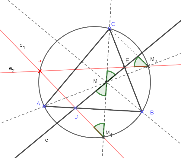Az is ismert, több helyen szereplő feladat, hogy a háromszög magasságpontján átmenő tetszőleges \(\displaystyle e\) egyenesnek a háromszög oldalaira vonatkozó tükörképei a körülírt körön metszik egymást. Ennek igazolásához elegendő megmutatni, hogy a tükrözött egyenesek közül bármelyik kettő a körülírt körön metszi egymást, mivel az egyik körrel alkotott metszéspont minden esetben a magasságpontnak az oldalra vonatkozó tükörképe. Legyenek az \(\displaystyle M\) magasságpontnak az oldalakra vonatkozó tükörképei \(\displaystyle M_1\), \(\displaystyle M_2\), az \(\displaystyle e\) egyenes oldalakra vonatkozó tükörképei pedig \(\displaystyle e_1\) és \(\displaystyle e_2\).