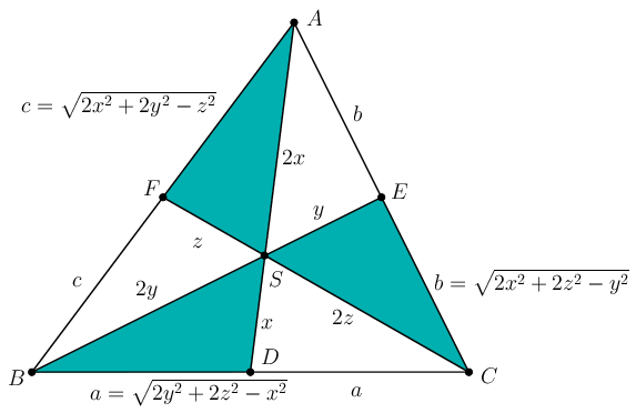 Mint jól ismert, a \(\displaystyle BCS\) háromszögben az \(\displaystyle SD\) súlyvonalra \(\displaystyle 4SD^2=2SB^2+2SC^2-BC^2\), azaz \(\displaystyle 4x^2=8y^2+8y^2-4a^2\); ebből azt kapjuk, hogy \(\displaystyle a=\sqrt{2y^2+2z^2-x^2}\). Hasonlóan, \(\displaystyle b=\sqrt{2x^2+2z^2-y^2}\) és \(\displaystyle c=\sqrt{2x^2+2y^2-z^2}\).