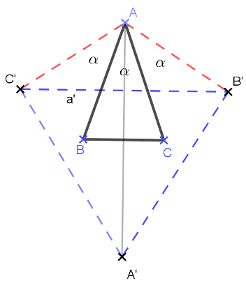 B. 5001. Egy egyenlő szárú háromszög alapja \(\displaystyle a\), szárszöge \(\displaystyle 120^{\circ}\)-nál kisebb, az alaphoz tartozó magassága \(\displaystyle m\). A háromszög mindegyik csúcsát tükrözzük a szemközti oldalegyenesre. A három kapott pont egy másik egyenlő szárú háromszöget alkot, amelynek alapja \(\displaystyle a'\), alaphoz tartozó magassága pedig \(\displaystyle m'\). Mutassuk meg, hogy