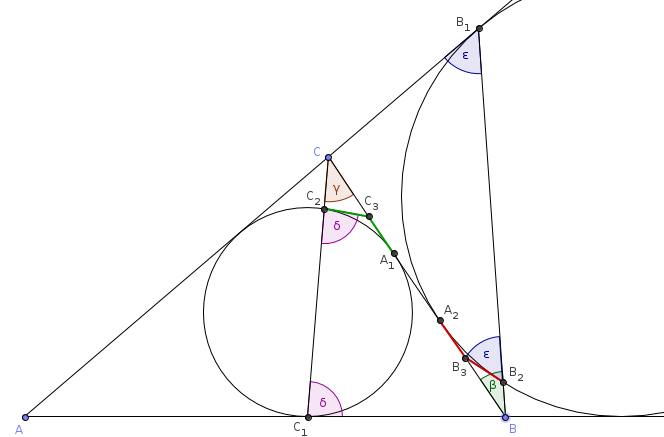 Most kiszámítjuk \(\displaystyle C_2C_3\) hosszát. A \(\displaystyle C_3\) pontból a beírt körhöz húzott érintő szakaszok egyenlők; legyen \(\displaystyle C_2C_3=C_3A_1=x\). A \(\displaystyle C_3\) pont a \(\displaystyle CA_1\) szakasz belsejében helyezkedik el, ezért \(\displaystyle CC_3=CA_1-C_3A_1=(s-c)-x\). Legyen \(\displaystyle \gamma=BCC_1\measuredangle\) és \(\displaystyle \delta=CC_1B\measuredangle\). A beírt körhöz \(\displaystyle C_1\)-ben és \(\displaystyle C_2\)-ben húzott érintők ugyanakkora szöget zárnak be a \(\displaystyle C_1C_2\) húrral, ezért \(\displaystyle C_3C_2C_1\measuredangle=\delta\).