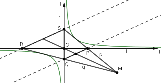 Megoldás. Legyen a két aszimptota \(\displaystyle i\) és \(\displaystyle j\), a két aszimptota ideális pontjai \(\displaystyle I\), illetve \(\displaystyle J\). Az aszimptoták az ideális pontokban érintik a hiperbolát. Továbbá legyen \(\displaystyle p=MP\) és \(\displaystyle q=MQ\), \(\displaystyle R=q\cap i\) és \(\displaystyle S=p\cap j\).