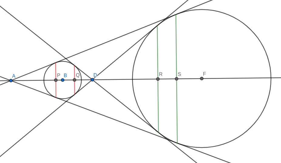 Az \(\displaystyle A\) és \(\displaystyle D\) pontokon át közös érintőket húzunk a körökhöz. Ekkor a piros szakaszok távolsága megegyezik a kék szakaszok távolságával.