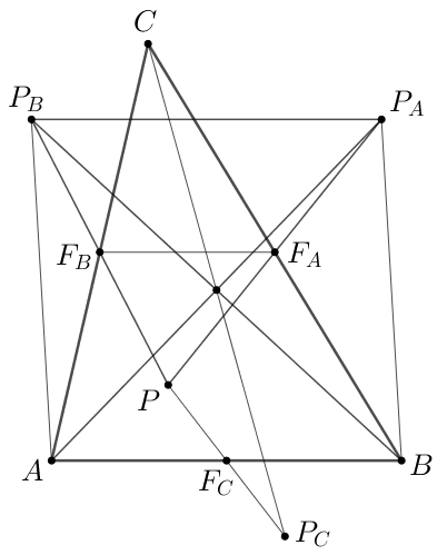 Például a \(\displaystyle PP_AP_B\) háromszög \(\displaystyle P_AP_B\)-vel párhuzamos \(\displaystyle F_AF_B\) középvonala egybeesik az \(\displaystyle ABC\) háromszög \(\displaystyle AB\)-vel párhuzamos középvonalával. Ezért az \(\displaystyle AB\) és a \(\displaystyle P_AP_B\) szakaszok párhuzamosak és egyenlő hosszúságúak, azaz \(\displaystyle ABP_AP_B\) paralelogramma, amelynek \(\displaystyle AP_A\) és \(\displaystyle BP_B\) átlói felezve metszik egymást. Mivel ugyanezzel a gondolatmenettel kapjuk, hogy \(\displaystyle AP_A\) és \(\displaystyle CP_C\) is felezve metszik egymást, a három szakasz felezőpontja egybeesik.