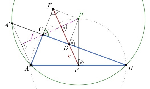 Legyen \(\displaystyle P\) az \(\displaystyle ABA'\) háromszög köré írt kör középpontja; ezen átmennek az \(\displaystyle AB\), \(\displaystyle BA'\) és \(\displaystyle AA'\) szakaszok felezőmerőlegesei, másképpen az \(\displaystyle AB\)-re \(\displaystyle F\)-ben állított merőleges, a \(\displaystyle BC\)-re \(\displaystyle D\)-ben állított merőleges és \(\displaystyle f\). A \(\displaystyle CDP\) háromszög \(\displaystyle f\)-re vonatkozó tükörképe a \(\displaystyle CEP\) háromszög, ezért \(\displaystyle CEP\sphericalangle=CDP\sphericalangle=90^\circ\), tehát a \(\displaystyle CA\)-ra \(\displaystyle E\)-ben állított merőleges egyenes is átmegy \(\displaystyle P\)-n.