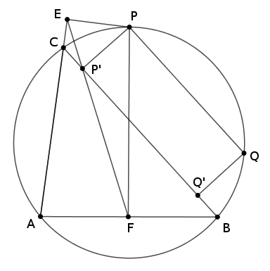 2. megoldás az \(\displaystyle AC < BC\) esetre. A háromszög körülírt körén a \(\displaystyle C\) pontot tartalmazó \(\displaystyle AB\) körív \(\displaystyle P\) felezőpontjáról megmutatjuk, hogy mindhárom egyenesen rajta van. Az \(\displaystyle AB\) felezőmerőlegese esetében ez nyilvánvaló. A \(\displaystyle P\) ponton átmenő, a \(\displaystyle BC\) oldallal párhuzamos egyenes messe a kört a \(\displaystyle P\)-től különböző \(\displaystyle Q\) pontban. A \(\displaystyle P\) és \(\displaystyle Q\) merőleges vetülete a \(\displaystyle BC\) oldalon \(\displaystyle P'\), illetve \(\displaystyle Q'\). Ekkor \(\displaystyle P'Q'=PQ\), \(\displaystyle CP'=Q'B\). A kerületi szögek tétele szerint (a szokásos jelölésekkel):