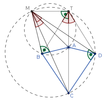 Megoldás. Legyen az \(\displaystyle M\) pont merőleges vetülete az \(\displaystyle AC\) egyenesen \(\displaystyle T\). Mivel \(\displaystyle ABM\measuredangle=MTA\measuredangle=MTC\measuredangle=MDC\measuredangle=90^\circ\), a Thalész-tétel megfordítása szerint az \(\displaystyle A,B,M,T\), illetve a \(\displaystyle C,D,M,T\) pontok egy körön vannak. Emiatt (irányított, modulo \(\displaystyle 180^\circ\) szögekkel számolva) \(\displaystyle BMA\measuredangle=BTA\measuredangle\), illetve \(\displaystyle CMD\measuredangle=CTD\measuredangle\). Mivel \(\displaystyle T\) a deltoid szimmetriatengelyén van, a \(\displaystyle BTA\measuredangle=BTC\measuredangle\) és \(\displaystyle ATD\measuredangle=CTD\measuredangle\) szögek egymás tükörképei. Tehát
