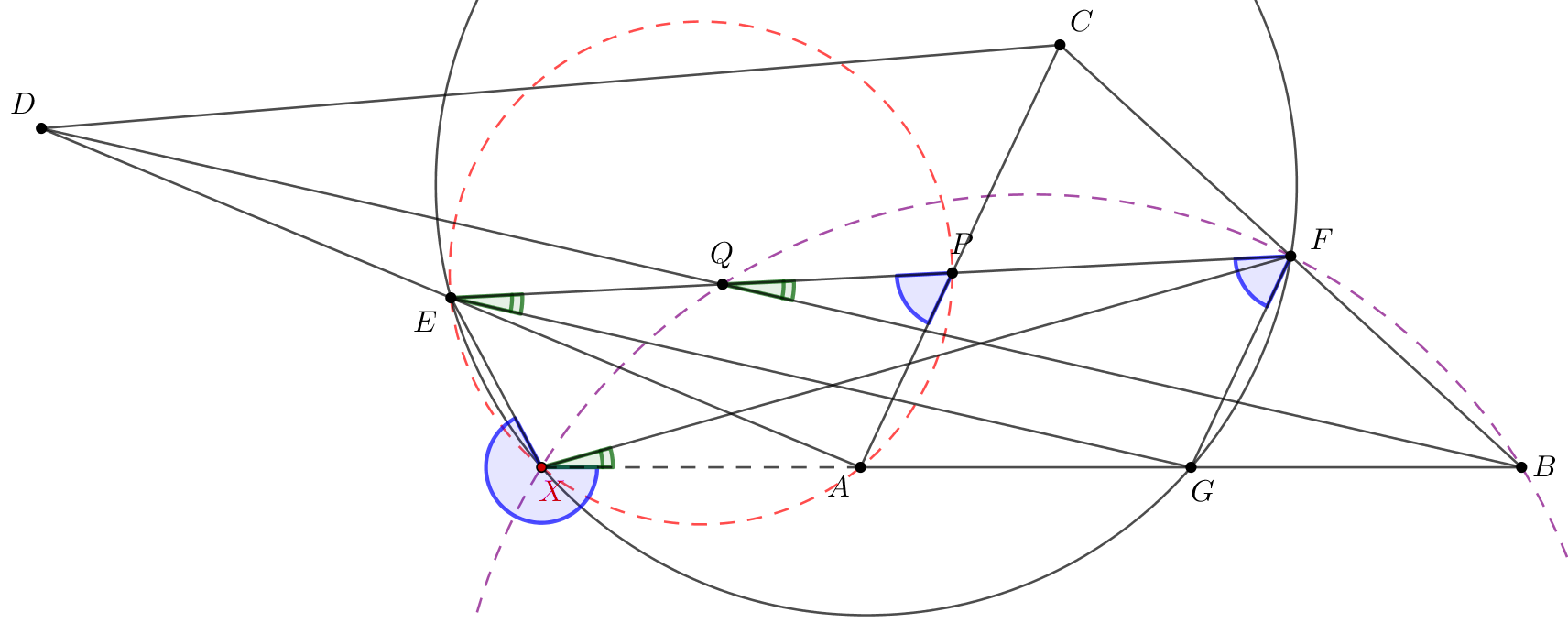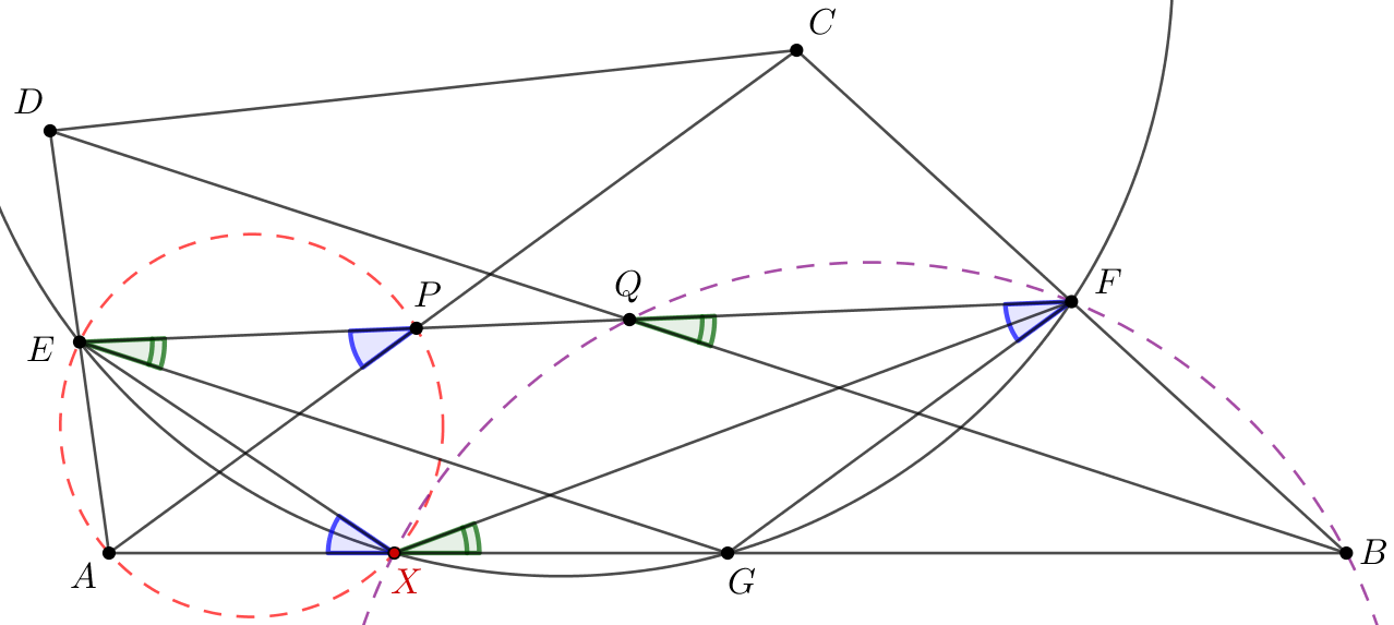 Megoldás. Legyen \(\displaystyle AB\) felezőpontja \(\displaystyle G\), és legyen \(\displaystyle X\) az \(\displaystyle EFG\) kör második, \(\displaystyle G\)-től különböző metszéspontja az \(\displaystyle AGB\) egyenessel; ha az \(\displaystyle AB\) egyenes \(\displaystyle G\)-ben érinti az \(\displaystyle EFG\) kört, akkor legyen \(\displaystyle X=G\). Azt fogjuk igazolni, hogy az \(\displaystyle AEP\) és a \(\displaystyle BFQ\) kör is átmegy az \(\displaystyle X\) ponton. Mivel az \(\displaystyle A\) és \(\displaystyle B\) pontok szerepe felcserélhető, elég azt igazolnunk, hogy az \(\displaystyle AEP\) kör átmegy \(\displaystyle X\)-en.