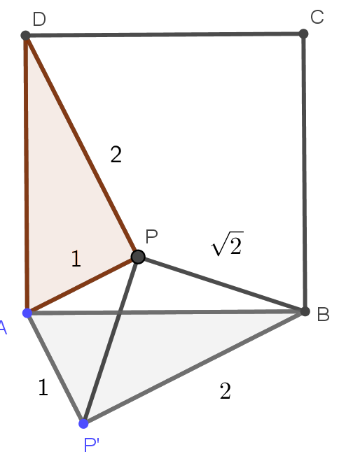A megoldás során azt is látjuk, hogy \(\displaystyle AP'B\sphericalangle=AP'P\sphericalangle+P'PB\sphericalangle=45^{\circ}+45^{\circ}=90^{\circ}\), tehát a négyzet oldala \(\displaystyle \sqrt{5}\) egység.