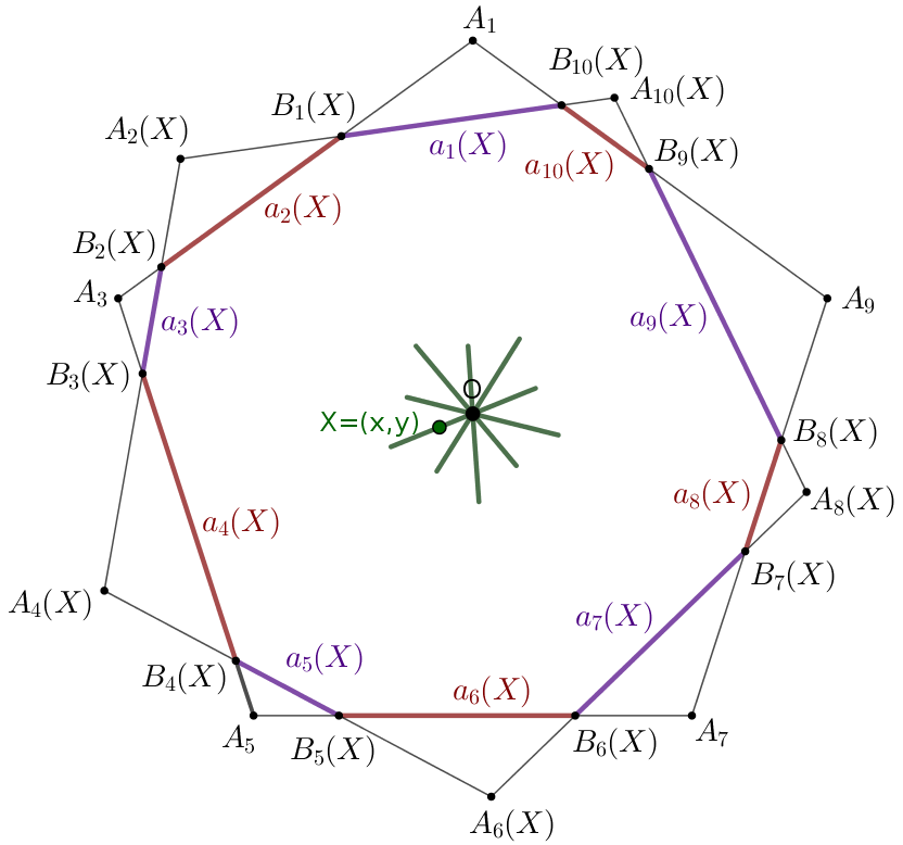 2. megoldás (vázlat). Az ötszögek oldalait válasszuk egségnyinek. Rögzítsük az egyik, az \(\displaystyle A_1A_3A_5A_7A_9\) ötszöget, a középpontját jelölje \(\displaystyle O\), és rögzítsük a második \(\displaystyle n\)-szög oldalainak irányát; a második ötszög középpontja legyen az \(\displaystyle X=(x,y)\) változó pont. A második ötszög csúcsai az \(\displaystyle X\) függvényei, jelölje ezeket \(\displaystyle A_2(X),A_4(X),A_6(X),A_8(X),A_{10}(X)\). Az \(\displaystyle A_{k-1}A_{k+1}\) és \(\displaystyle A_kA_{k+2}\) egyenesek metszéspontja legyen \(\displaystyle B_k(X)\); a keletkező tízszög oldalainak előjeles hossza \(\displaystyle a_k(X)=\overrightarrow{B_{k-1}B_{k}}\cdot\overrightarrow{A_{k-1}A_{k+1}}\). Ha a \(\displaystyle B_1B_2\ldots B_{10}\) töröttvonal egy konvex tízszöget határol, akkor az \(\displaystyle a_k\) számok mind azonos előjelűek. Azt fogjuk igazolni, hogy