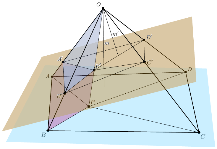 Tetszőleges \(\displaystyle X,Y,Z,W\) pontok esetén jelölje \(\displaystyle v_{XYZW}\) az \(\displaystyle XYZW\) tetraéder térfogatát. Legyen a gúla magassága, vagyis az \(\displaystyle O\) pont távolsága az \(\displaystyle ABCD\) síktól \(\displaystyle m\), az \(\displaystyle A'BC'D'\) síktól pedig \(\displaystyle m'\), továbbá legyen \(\displaystyle a\), \(\displaystyle b\), \(\displaystyle c\), \(\displaystyle d\) és \(\displaystyle p\) az az öt valós szám, amelyre \(\displaystyle \overrightarrow{OA'} = a\cdot \overrightarrow{OA}\), \(\displaystyle \overrightarrow{OB'} = b\cdot \overrightarrow{OB}\), \(\displaystyle \overrightarrow{OC'} = c\cdot \overrightarrow{OC}\), \(\displaystyle \overrightarrow{OD'} = d\cdot \overrightarrow{OD}\), illetve \(\displaystyle \overrightarrow{OP'} = p\cdot \overrightarrow{OP}\). (A pontok és két sík elhelyezkedésétől függően az \(\displaystyle a,b,c,d,p\) számok pozitívak és negatívak is lehetnek.)