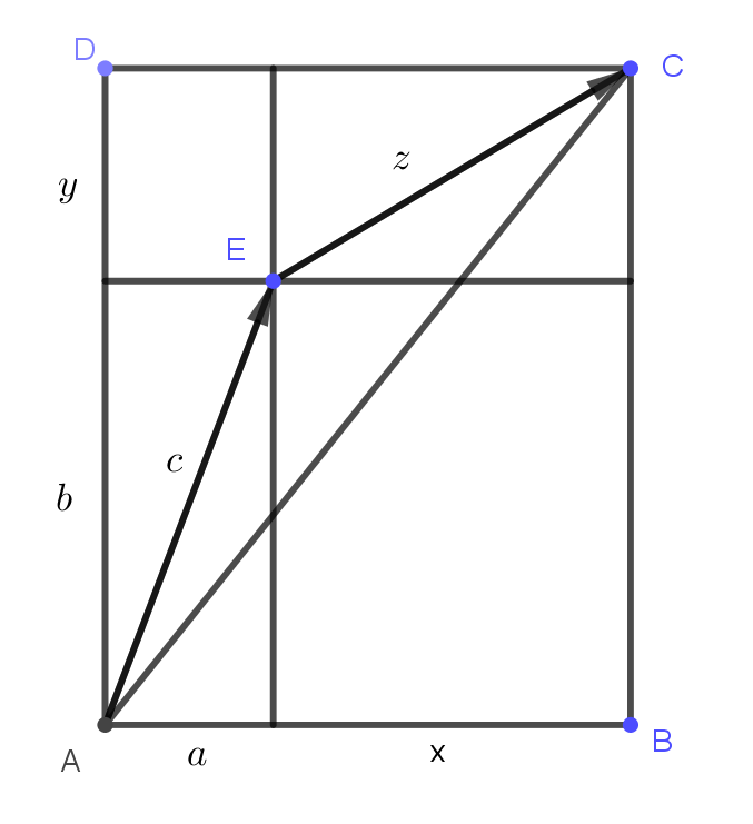 Az ábráról azonnal leolvasható, hogy az \(\displaystyle AE, EC, AC\) szakaszok rendre az \(\displaystyle a, b\), \(\displaystyle x, y\) és \(\displaystyle a+x, b+y\) befogójú derékszögű háromszög átfogói. Az \(\displaystyle E\) pont mindenképpen az \(\displaystyle ABCD\) téglalap belső pontja, tehát ebből a pontból az \(\displaystyle AC\) átfogó tompaszögben látszik. A háromszög-egyenlőtlenség alapján