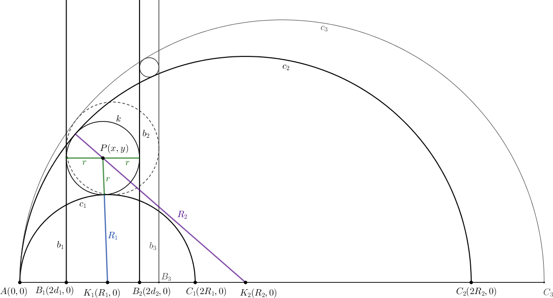 $$\begin{gather*} y^2 = (R_1+d_2-d_1)^2-(d_1+d_2-R_1)^2 = 4d_2(R_1-d_1). \tag{1} \end{gather*}$$Hasonlóan, \(\displaystyle k\) akkor és csak akkor érinti belülről a \(\displaystyle c_2\) félkört, ha \(\displaystyle r<R_2\) (ezt már ellenőriztük), \(\displaystyle y>0\) és \(\displaystyle K_2P=R_2-r\);