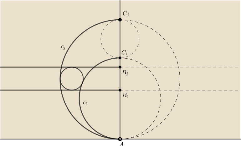 Megjegyzés. A feladat szorosan kapcsolódik a márciusi számban megjelent Térbe kilépő bizonyítások VI. c. cikkhez. Az ábrát \(\displaystyle 90^\circ\)-kal elforgatva és a Poincaré-féle félsíkmodellben értelmezve a \(\displaystyle b_i\) és \(\displaystyle b_j\), illetve \(\displaystyle c_i\) és \(\displaystyle c_j\) horociklusok távolsága is állandó.