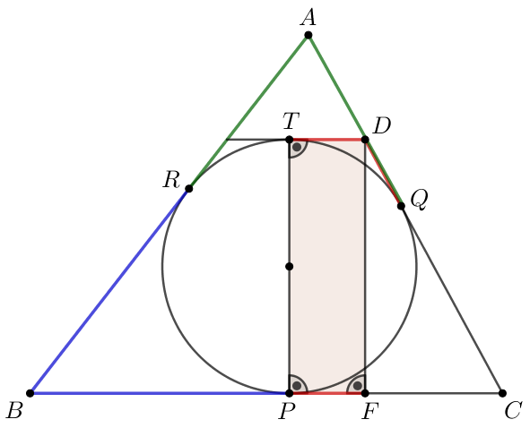 A téglalap szemközti oldalai egyenlők, emiatt \(\displaystyle FP=DT\). Továbbá, a körhöz az \(\displaystyle A\), a \(\displaystyle B\), illetve a \(\displaystyle D\) pontból húzott érintő szakaszok egyenlők, így \(\displaystyle AQ=AR\), \(\displaystyle BP=BR\) és \(\displaystyle DQ=DT=FP\). Mindezeket figyelembe véve: